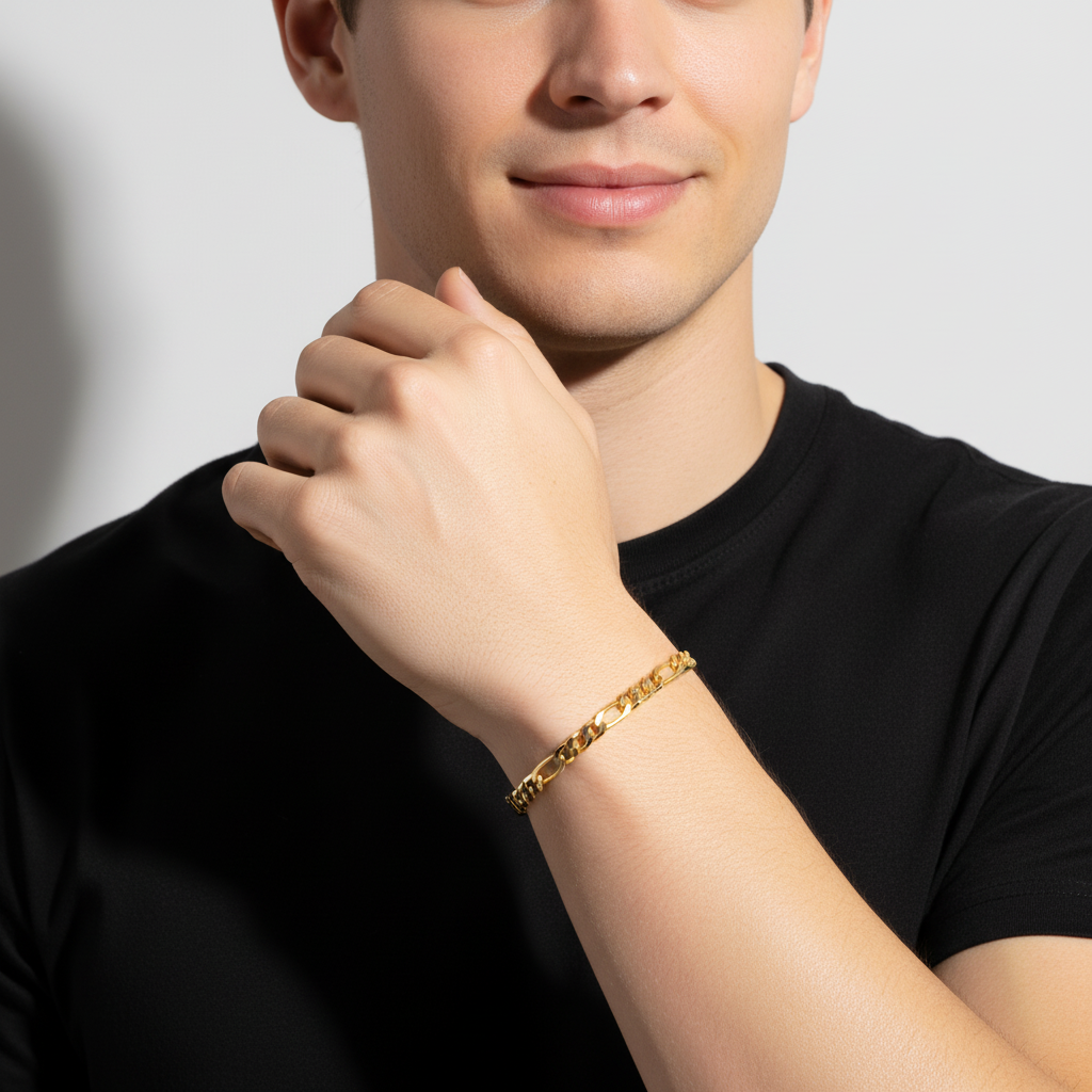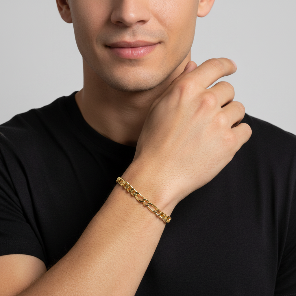 Dieses elegante Figaroarmband aus 585er vergoldetem Messing kombiniert klassisches Design mit hochwertiger Verarbeitung. Mit seiner 4 mm Breite bietet es die perfekte Balance zwischen zarter Eleganz und spürbarer Präsenz. Ein vielseitiges Accessoire, das jedem Outfit eine luxuriöse Note verleiht.
