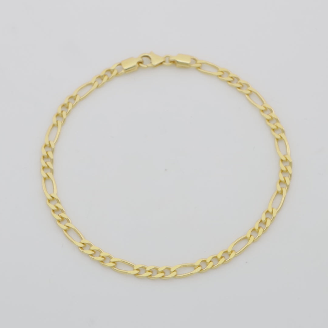 Dieses elegante Figaroarmband aus 585er vergoldetem Messing kombiniert klassisches Design mit hochwertiger Verarbeitung. Mit seiner 4 mm Breite bietet es die perfekte Balance zwischen zarter Eleganz und spürbarer Präsenz. Ein vielseitiges Accessoire, das jedem Outfit eine luxuriöse Note verleiht.