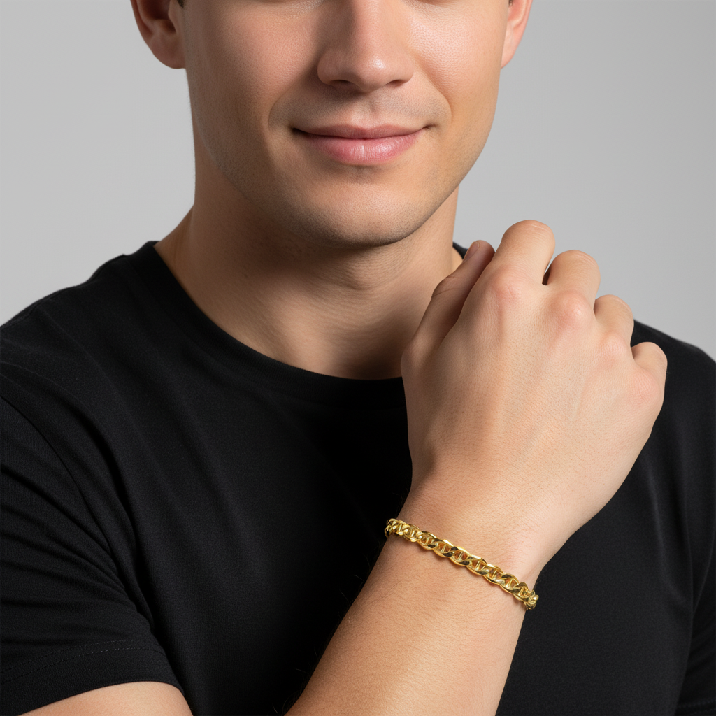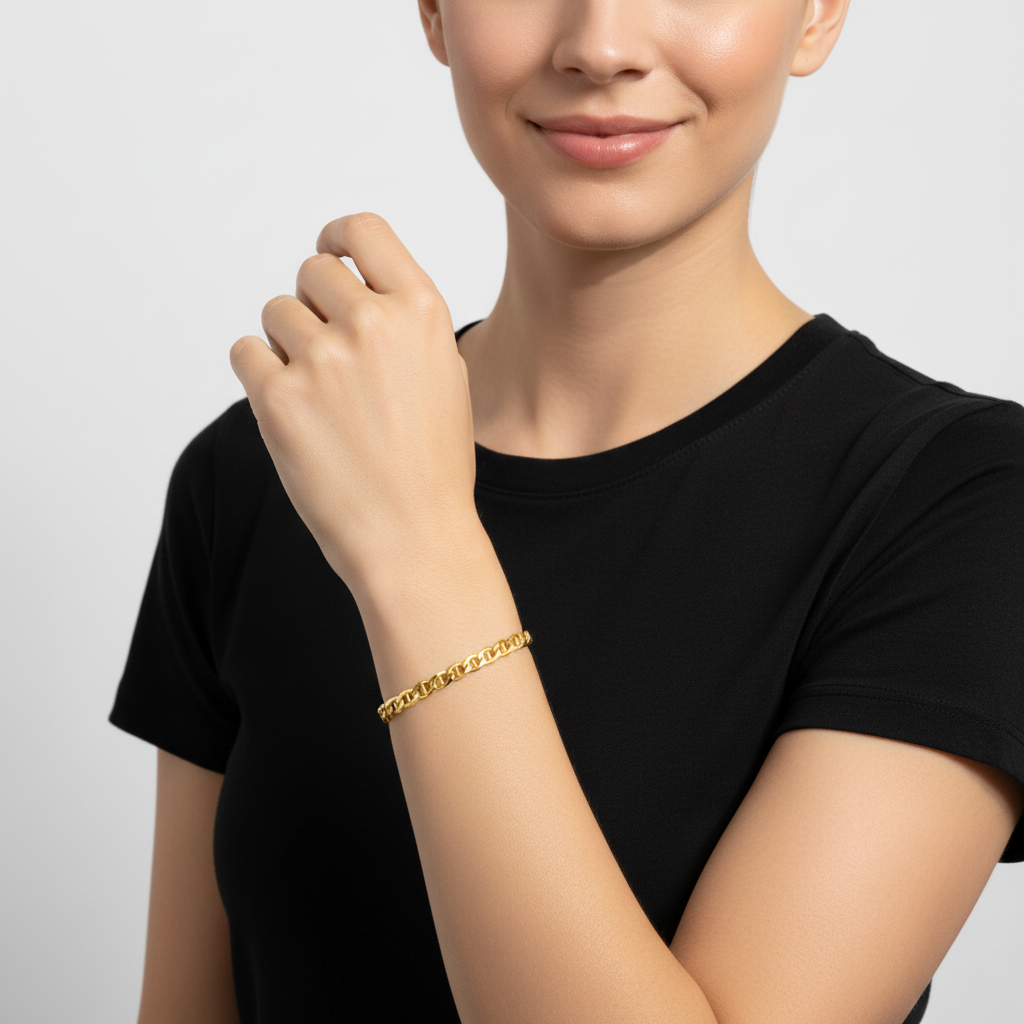 Dieses stilvolle Stegpanzerarmband ist 4,5 mm breit und mit hochwertigem 585er Gold vergoldet, was ihm einen edlen, warmen Glanz verleiht. Das markante Design mit Stegstruktur verleiht dem klassischen Panzerstil eine moderne Note – perfekt für elegante Auftritte im Alltag oder zu besonderen Anlässen.